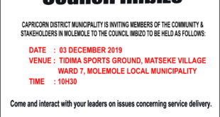Read More »Invitation to Council Imbizo on 03 December 2019 at Tidima Sports Ground, Matseke Village