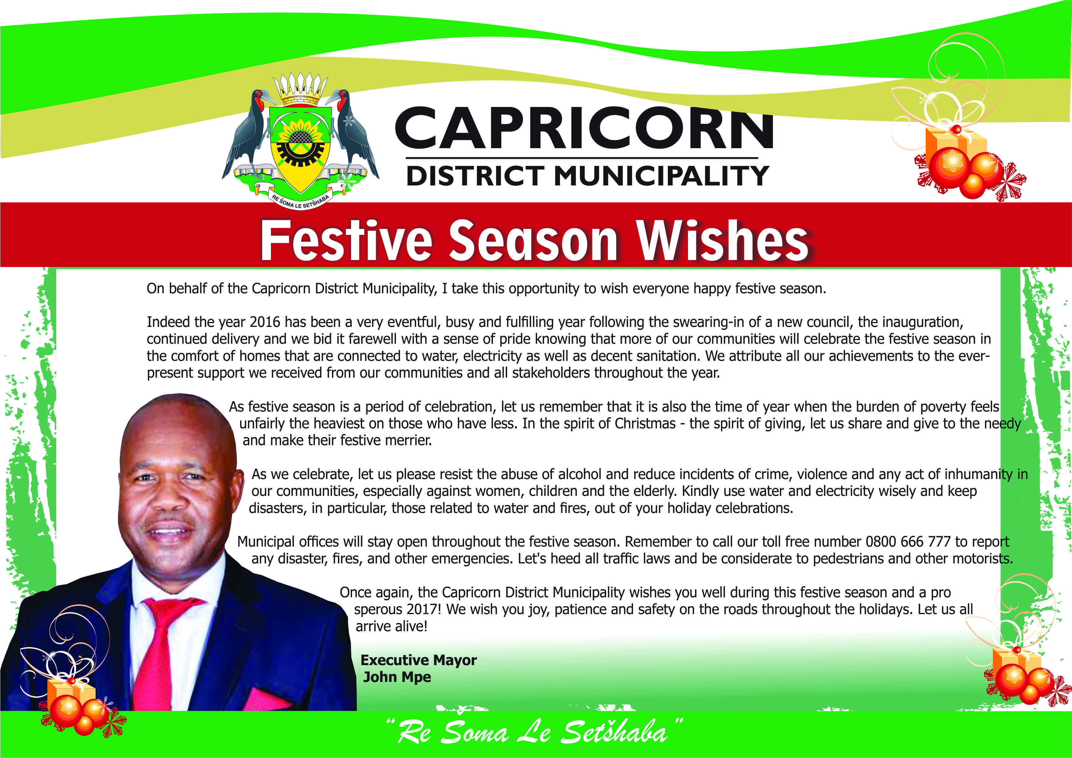 On behalf of the Capricorn District Municipality, I take this opportunity to wish everyone happy festive season. Indeed the year 2016 has been a very eventful, busy and fulfilling year following the swearing-in of a new council, the inauguration, continued delivery and we bid it farewell with a sense of pride …